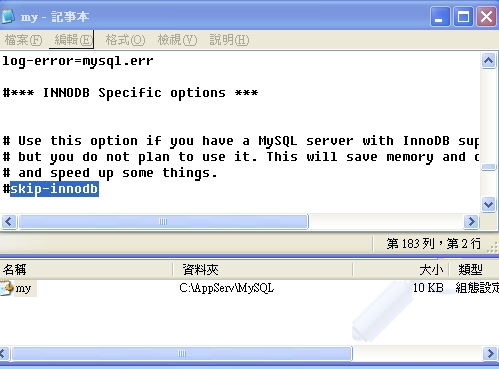 | 首先,要先找到my.ini去設定phpmyadmin的innodb的參數: |