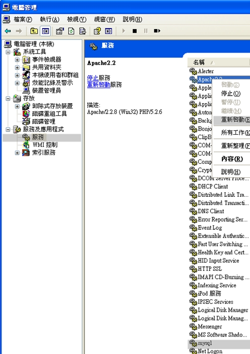 | 2.出下以下電腦管理的畫面後,將服務及應用程式展開,然後點選服務,找到Apache跟mysql後,可以點右鍵選重新啟動,或者旁邊就有可以點的連結的。 |