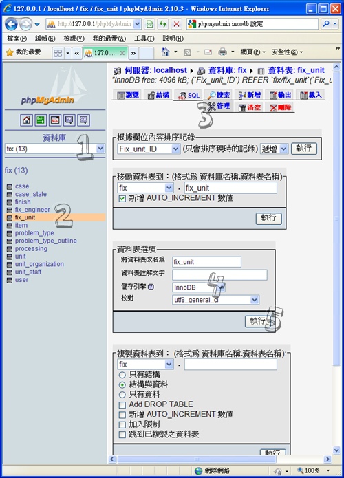 | 1.選擇你的db 2.選擇要做key的table 3.點選管理 4.將儲存引擎修改成InnoDB 5.執行 |