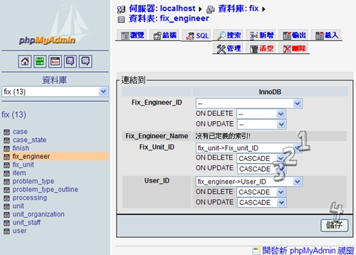 | 參考資料:phpMyAdmin 設定 mysql foreign key、MySql設定外來鍵、InnoDB 實現了 MySQL 的 Foreign Key。 |