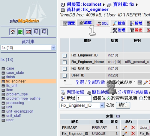 | 執行完後,php的經紀人phpmyadmin就可以做關聯式的動作了,不過還是有些小地方要先修改: |