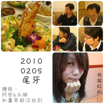 | 這是我離開學校之後,第二次吃尾牙。 第一次是1/27中山電訪的,不過我比較好奇的是,我小小工讀生一枚居然可以吃尾牙耶XD 一去寒喧和平啊, 穿著十三公分的鞋,就要移兩台比我的小四大兩倍車,還兩台,真的是... 坐電梯上三樓之後,走進有意廳(是嗎?),就有感覺到今天不會這麼容易結束,因為,圓桌的旁邊有個沙發,沙發的旁邊有張茶几,茶几的上面,放了一手的紅酒.......... 范大哥很可愛一直狂感嘆以後是我們的時代,還一直幫德慶虧羅妹妹,害得人家都不知道該不該走進來幫我們斟茶倒酒..XD 老闆今天中午聽說是吃了條讓他腸胃不太舒服的魚,所以都沒什麼吃喝, 德慶是一直臉紅傻笑,阿哲是乾了一杯之後整個人嗆起來XD,晉鋐是完全面不改色還不幫我,永勝則是默默的吃喝。 最後到的是蕭哥,同樣是巨蟹座,跟我和羅妹妹都一樣,呵呵呵,果然是都很看場面的人。 大家吃阿喝的,So High,我還喝了『快』一支紅酒,雖然說紅酒不太會醉,但是整個人漲紅起來真的也是不太舒服,所以我去挖了三次,當然退很快。 寫到這,我才想到,我的奶酪布丁還在冰箱啊~ 明天的甜點,就決定是你了。 吃吃喝喝聊聊天,范大哥總算拿到羅妹妹的手機號碼,還交代他要按時傳簡訊,真的很可愛XD 最後,老闆還督促我搭計程車回去,不要為了省那些錢被開單,為此,我可是拿出我的學生一卡通坐上一百號然後從遠百走回家,呼,十三公分真的是讓我體認到高雄未整修的中華路人行道是有多麼不友善了。 結果解久益我也沒吃...回家後連洗澡都不用就完全清醒,然後默默的整理房間。 總之,今天很開心,也很胖。 |